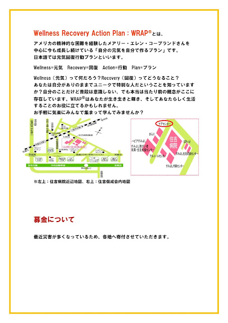 今月のよんもくWRAPのお知らせです。WRAPとは元気回復行動プラン(WRAP=Wellness Recovery Action Plan)の略称で、アメリカ人のMary Ellen Copeland(メアリー・エレン・コープランド)さんが、精神的な困難を抱えている人たちとともに自身も苦しんでいた精神的な病いに対処して自らの主導権を失わずに元気を回復する方法を作ったことが原点です。
