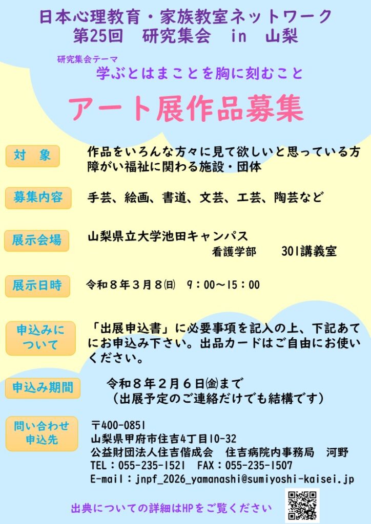 日本心理教育・家族教室ネットワーク第25回研究集会in山梨では、大会期間中に「言葉に頼らない対話 アートによる学び展」を開催します。