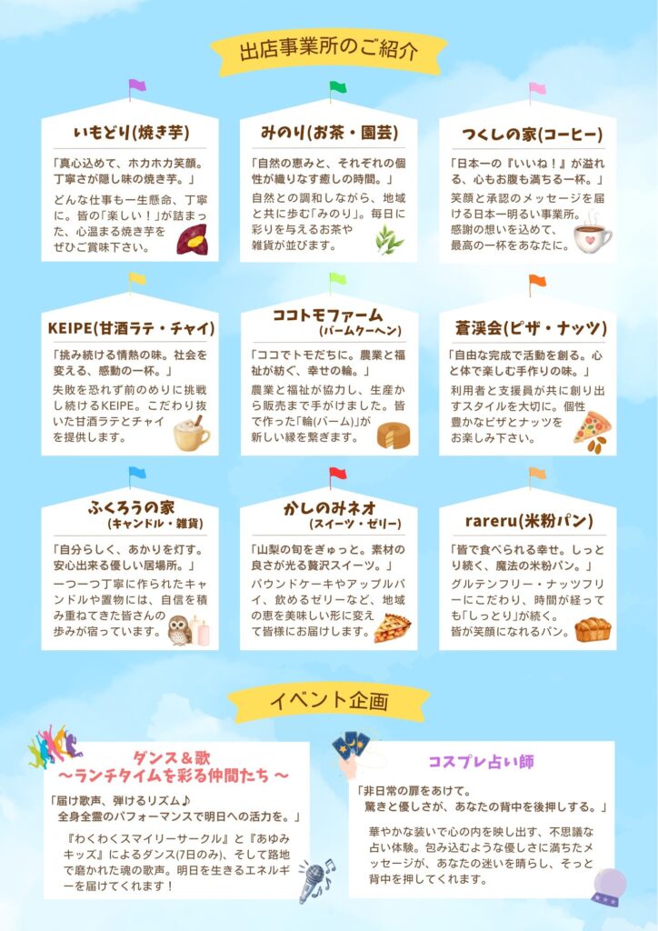 マルシェ企画として…テーマ「学ぶことはまことを胸に刻むこと」に沿って、参加してくださる事業所様が、着々と決まって参りました。マルシェの企画&担当者によるとどこの、事業所様も快く引き受けて下さいまして、当日楽しみにしているとのことでした。