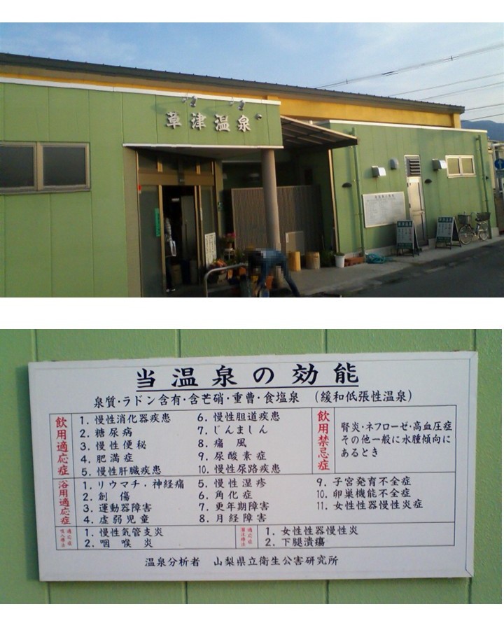 この銭湯は甲府市内にある有名な温泉銭湯「で、早朝(6時)からご近所の常連さんで男湯の洗い場はかなり混雑していました。ここは戦前から銭湯として営業していたのだそうですが、ある時ボーリングしてみたところ温泉が湧出したために温泉浴場として営業を開始したそうです。草津温泉の由来は「熱いお湯だから」と、番台の方から教えていただきました。
