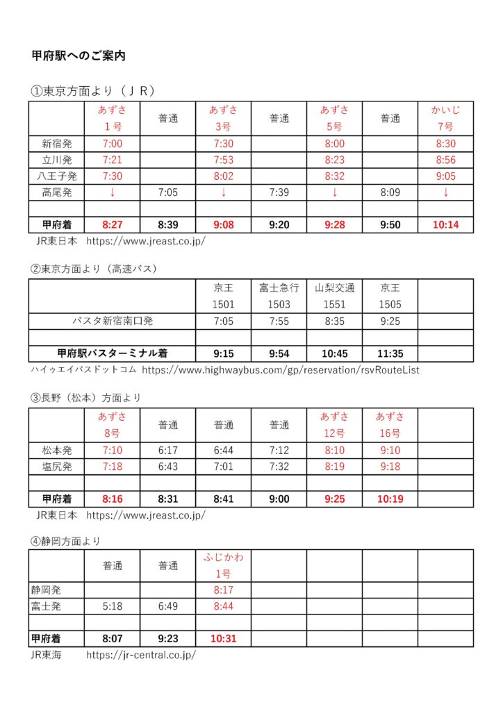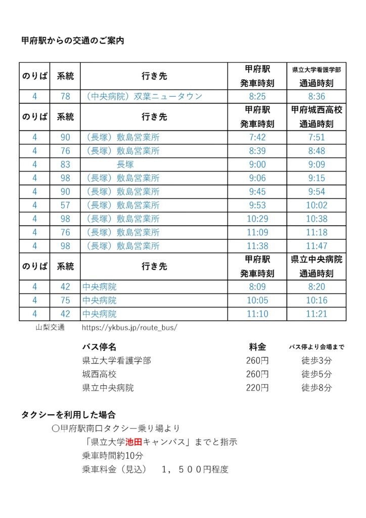次に甲府駅からのアクセスですが、タクシーご利用の方向けにおおよその料金(値上げされている可能性があります)、または路線バスをご利用の方向けに時刻表を載せておきます。