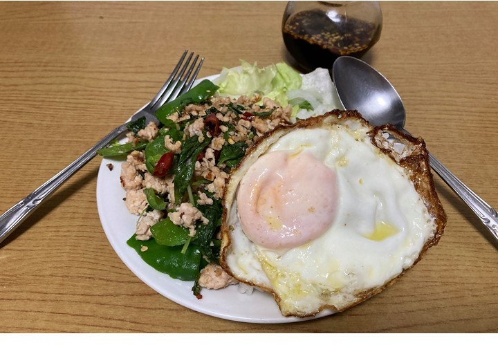 「ガパオってなに?」という声をうかがいましたので、私が時々食べているガパオについてお話しします。ガパオはよく知られたタイ料理の一つで、ガパオライスは現地ではパッガパオガイ・ラーカオ・カイダーオドゥワイ(ホーリーバジル炒めご飯目玉焼き添え)ということになります。のご紹介です